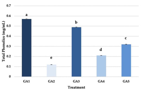 Total polyphenolics in the final fermented product characteristics for five apple and grape pomace-based fermentations: a purely grape pomace-based treatment [GA1 (1:0)], a purely apple pomace-based treatment [GA2 (0:1)], a predominantly grape pomace-based treatment [GA3 (3:1)], a predominantly apple-based pomace treatment [GA4 (1:3)], and an evenly weighted apple and grape pomace-based treatment [GA5 (1:1)]. The bar indicates the standard deviation of the mean for individual treatments (n = 3). The different letters above the bars and the color depth of the bars indicate significant differences (p < 0.05).