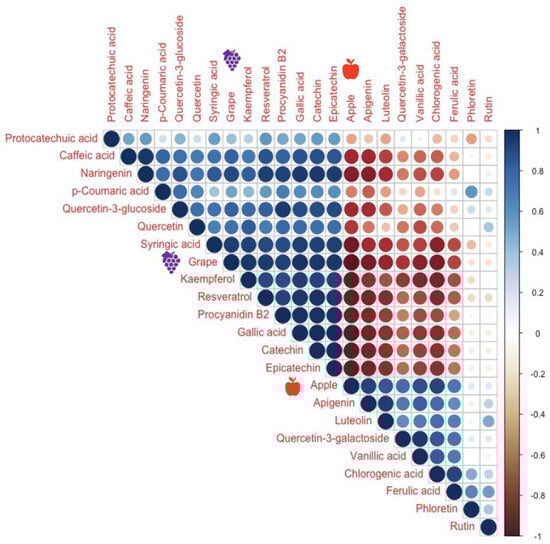 Phenolic compound correlation in final products of five apple and grape pomace-based fermentations: a purely grape pomace-based treatment [GA1 (1:0)], a purely apple pomace-based treatment [GA2 (0:1)], a predominantly grape pomace-based treatment [GA3 (3:1)], a predominantly apple-based pomace treatment [GA4 (1:3)], and an evenly weighted apple and grape pomace-based treatment [GA5 (1:1)]. Positive correlations are displayed in blue and negative correlations in red color. Color intensity and the size of the circle are proportional to the correlation coefficients. The right legend bar color shows the correlation coefficients and the corresponding colors. Grape and apple signs highlight the materials in matrix correlations.