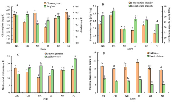 Changes in enzyme activity in different medium-high temperature Daqu. (A) Glucoamylase, α-amylase. (B) Fermentation capacity, esterification capacity. (C) Neutral protease activity, acid protease. (D) Cellulase, hemicellulase. Data are presented as mean ± SD (n = 3). Bars with different letters indicate significant difference (p < 0.05).