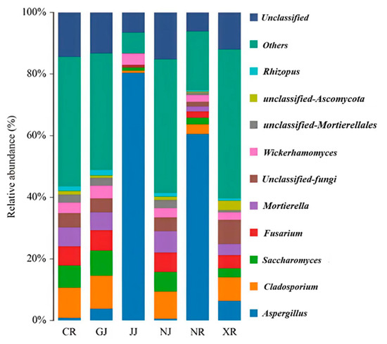The microbial community composition and diversity of medium-high temperature Daqu were investigated in this study, revealing distinct bacterial and fungal genera across different types of Daqu. A total of 542 bacterial genera (Figure 5) and 632 fungal genera (Figure 6) were identified in artificial Daqu (XR, CR, NR) and mechanical Daqu (JJ, GJ, NJ). The dominant bacterial communities exhibited significant variation among the samples. In CR, GJ, and NJ, the high-abundance bacterial genera were primarily Sphingomonas, unclassified Bacillaceae, Delftia, and Pseudogracilibacillus, whereas in JJ and XR, Cetobacterium, Escherichia, and Shigella were predominant. In NR, Thermoactinomyces and Virgibacillus were the dominant bacterial genera. Similarly, the fungal communities exhibited distinct patterns, with Aspergillus, Cladosporium, Saccharomyces, Fusarium, and Mortierella being the predominant genera in CR, GJ, NJ, and XR, whereas Aspergillus was the dominant fungal genus in JJ and NR. These findings are consistent with previous studies that have emphasized the role of specific microbial communities in the fermentation process of Daqu, particularly in the production of ethanol, organic acids, and esters [40,43].