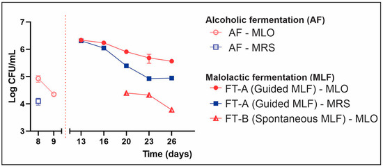 In contrast, in the FT-A, counts of the inoculated LAB were obtained from the beginning of MLF. This is because they underwent prior acclimation (incubation in a medium with a high content of glucose and fructose and sublethal concentrations of ethanol), which favours their viability and metabolic activity under the stressful conditions of wine. These adaptations are related to changes in the composition and properties of the bacterial plasmatic membrane, such as modifications in the fatty acid composition and protein profiles [17,28,29,30,31].