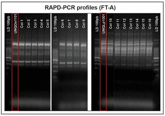 Implantation analysis carried out by RAPD-PCR in Guided-MLF tank (FT-A), inoculated with Lpb. plantarum UNQLP1001 and O. oeni UNQOe1101. The electrophoretic profiles of the strains inoculated (marked in red in the figure) were compared with the profiles obtained for the isolates from the MLF. LD: Ladder. Col 1–16: number assigned to colonies growing in MRS or MLO.