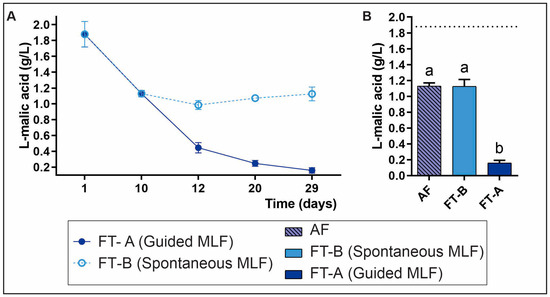 The concentration of L-malic acid in the samples corresponding to different stages of the MLF (days 10, 13, 20, and 29) from each FT (A: guided MLF and B: spontaneous MLF) was determined using an enzymatic kit (L-Malic acid, BioSystems, Barcelona, Spain) in quintuplicate. Additionally, the concentration of acetic acid at the end of the fermentation process (day 29) was determined using an enzymatic kit (Acetic-acid, BioSystems, Barcelona, Spain) for FT-A and FT-B.