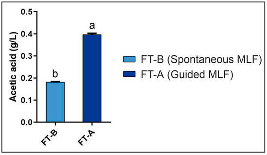 When acetic acid production was evaluated at the end of MLF (day 29) (Figure 4), a baseline production of acetic acid, around 0.18 g/L, can be attributed to the presence of AAB, whose persistence during the fermentation process we have previously demonstrated [11,12]. AABs are concerning due to their potential detrimental capacity, as they can alter the volatile acidity of the wine by producing a significant amount of acetic acid. It is worth mentioning that relatively high concentrations of acetic acid have been reported in bottled wines from this winery. However, it did not exceed the 0.8 g/L limit established by the Argentine regulatory institute [36]. Surprisingly, FT-A showed an acetic acid concentration of 0.4 g/L, which was significantly higher than FT-B. This increase in acetic acid concentration could be attributed to the heterofermentative metabolism of O. oeni, which is capable of producing lactic acid and ethanol or lactic acid and acetic acid, depending on the redox potential of the environment. On the other hand, the species Lpb. plantarum has a homofermentative metabolism, not related to an increase in volatile acidity [8,37,38,39]. Further studies on the metabolism of O. oeni UNQOe1101 are needed to assess its acetic acid-producing capability in order to re-evaluate the inclusion of this specific strain in future MLFS.