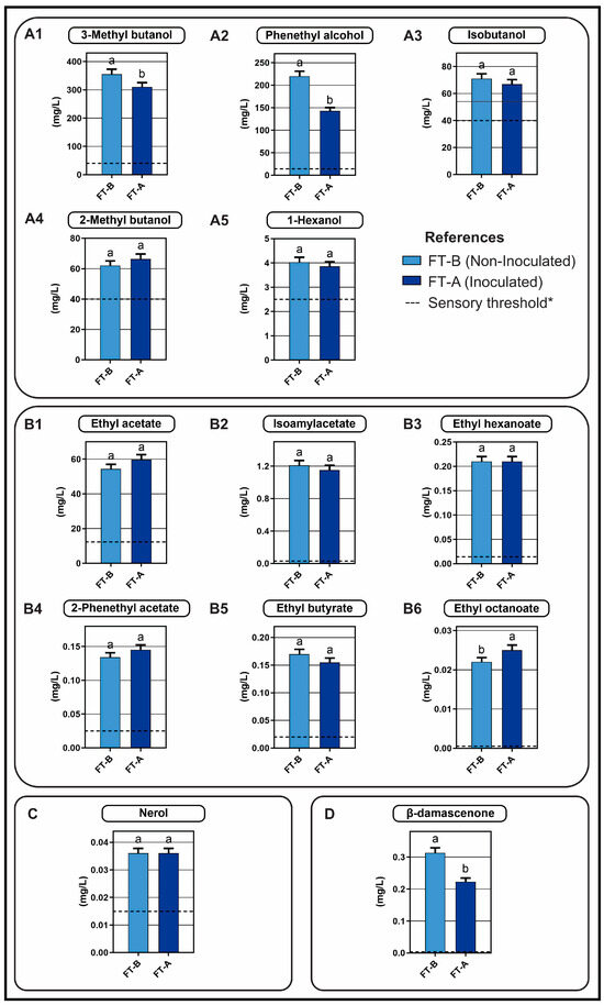 The comparison of ester concentrations between FT-A and FT-B (Figure 5), showed that only the concentration of ethyl octanoate increased significantly in FT-A. Meanwhile, no statistically significant modifications were observed in the concentrations of the other esters that exceeded the threshold. These results align with reports from other authors regarding the ability of LAB to contribute to the wine ester content in a strain-specific manner [58,59].