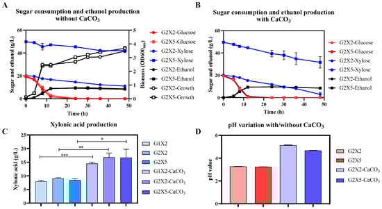 Sugar consumption, ethanol and xylonic acid production, and pH variation of Z. mobilis XA1. Fermentation performance in different sugar concentration medium without CaCO3 (A) and with CaCO3 (B) supplementation, as well as the titer of xylonic acid in the engineering strain XA1 (C) and pH variations with or without CaCO3 supplementation (D). The results shown are at least three replicates, and the error bars represent standard deviation. * Represents a significant difference (p-value < 0.05), ** represents a p-value < 0.01, and *** represents a p-value < 0.001.