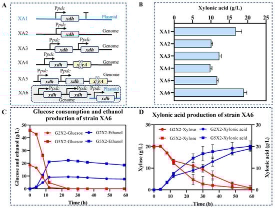 Fermentation performance of different recombinant strains with xdh gene integration. Schematic of different recombinant strains with xdh integration and xyrA deletion (A). Xylonic acid production of recombinant strains of XA1, XA2, XA3, XA4, XA5, and XA6 (B). Glucose consumption, ethanol production (C), and xylose consumption and xylonic acid production (D) of strain XA6. Error bars represent the standard deviation values obtained in triplicate experiments.