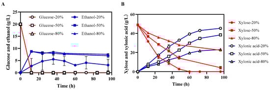 Our results demonstrated that it is difficult for the recombinant strain to fully utilize xylose greater than 50 g/L (Figure 1), which might be attributed to insufficient oxygen supply. A high xylonic acid titer and productivity can be achieved through a sealed oxygen supply–bioreactor (SOS-BR) technology [14]; the impact of oxygen on xylonic acid and ethanol co-production was investigated using recombinant strain XA3 in shake flasks containing different medium volumes of 20, 50, or 80% liquid volume (Figure 3). As shown in Figure 3A, almost all the glucose was consumed within 12 h, and the ethanol production was inhibited at the condition of 20% liquid volume compared with 50% and 80% liquid volume with a titer of 4.43 g/L (Figure 3A, Table 2). Our results showed that ethanol production was affected by the oxygenation of the medium in the shake flask similar to our previous work for isobutanol production [36], with more carbon sources flowing into byproducts such as acetic acid, glycerol, and acetoin instead of ethanol at aerobic conditions [37].