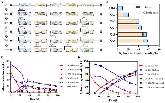 Moreover, the ratios of glucose and xylose of 1:1, 1:2, and 2:1 were also investigated using strain XA9 (Figure 4C,D). The results showed that the glucose and xylose had the fastest consumption rates when the ratio was 1:1. Nearly 62.6 ± 0.0 g/L glucose and 59.0 ± 0.0 g/L were consumed, resulting in 18.7 ± 0.4 g/L of ethanol produced within 24 h and 63.34 ± 2.07 g/L of xylonic acid at a productivity of 1.05 g/L/h within 60 h produced in the RMG50X50 medium (Figure 4C,D). With the increase in the concentration of glucose or xylose, the time of glucose consumption increased to 36 h with 19.3 ± 1.0 and 36.2 ± 4.7 g/L of ethanol produced in RMG50X100 and RMG100X50, respectively. Additionally, xylonic acid production with titers of 69.7 ± 1.4 g/L and 58.2 ± 1.4 g/L and yields of 1.08 ± 0.0 g/g and 1.06 ± 0.0 g/g was achieved in the RMG50X100 and RMG100X50 medium conditions, respectively, which is the highest titer and yield of xylonic acid production achieved in Z. mobilis.