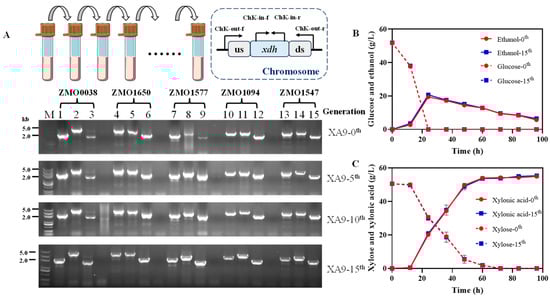 In addition, the fermentation performance of parental strain XA9 and strain XA9–15th was also investigated in RMG50X50 (Figure 5B,C). For instance, the ethanol production of XA9 and XA9–15th reached titers of 19.4 ± 1.16 and 20.7 ± 0.8 g/L, respectively, after a 24 h inoculation with all the glucose consumed (Figure 5B). Concurrently, there was no significant difference between XA9 and XA9–15th after a 96 h inoculation in the titers, which were 54.9 ± 0.5 g/L and 55.3 ± 0.3 g/L, respectively (Figure 5C). Therefore, all these results demonstrated that the recombinant strain XA9 has genetic and physiologic stability.