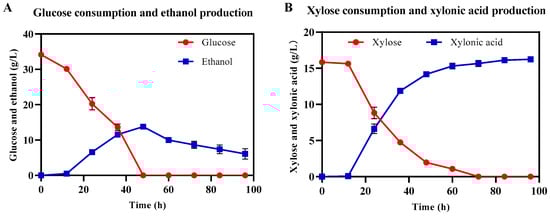 Fermentation performance of recombinant strain XA9 in lignocellulosic hydrolysate. Glucose consumption and ethanol production (A), as well as xylose consumption and xylonic acid production (B). The results shown are at least two, and the error bars represent standard deviation.