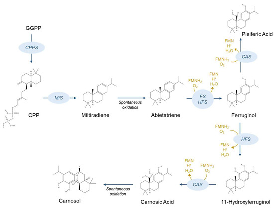 Biosynthetic pathway of CA. Legend: GGPP—geranylgeranyl diphosphate; CPP—copalyl diphosphate; CPPS—copalyl diphosphate synthase; MiS—miltiradiene synthase; FS—ferruginol synthase; CAS—carnosic acid synthase; HFS—hydroxyferruginol synthase. Adapted from [2,3,6].