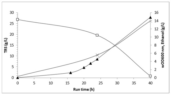 Variation in total recoverable sugars (TRS) (g/L), wOD600 nm and ethanol (g/L) of CA-producing strain during 40 h shake flask fermentations. Legend: –□– TRS (g/L); –▲– washed optical density (wOD600 nm); –x– ethanol (g/L). The data represent the mean of the measurements of 2 independent shake flask fermentations (error bars are negligible).