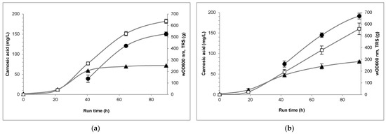 Variation in CA titer (mg/L), wOD600 nm and cumulative TRS consumed (g) during 90 h fed-batch fermentations at (a) DO trigger of 30%, first feed rate of 12 g/L/h and maximum feed rate of 26 g/L/h, and (b) dynamic DO trigger, first feed rate of 7 g/L/h and maximum feed rate of 8 g/L/h. Legend: –●– carnosic acid; –▲– washed optical density (wOD600 nm); –□– cumulative total recoverable sugars (TRS). The data represent the mean of the measurements of 2 independent bioreactors, and error bars indicate standard deviations from the mean.