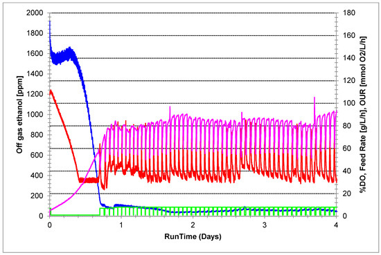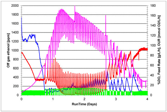 History plots of fed-batch fermentations with feed rate initial of 12 g/L/h, max. feed rate limit of 26 g/L/h and DO% trigger of 30%. Legend: variation in dissolved oxygen (DO%, red line), feed rate (g/L/h, green line), OUR (mmol O2/L/h, purple line), and off-gas ethanol (ppm, blue line) (1000 ppm off-gas ethanol corresponds to ~5.4 g/L ethanol).