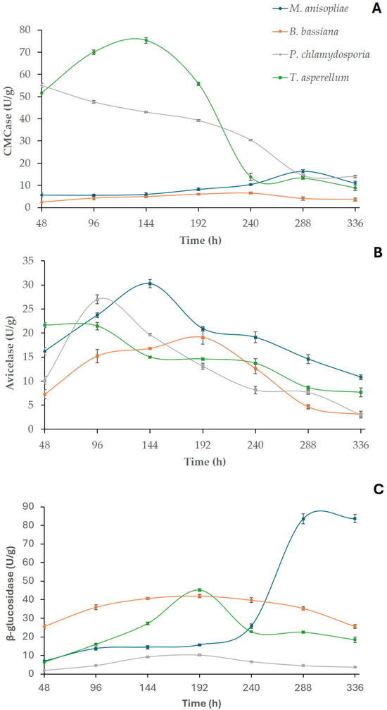 Regarding P. chlamydosporia HTM, this soil fungus is well known for its bionematicide properties [45]. Nevertheless, its potential for the biosynthesis of cellulases and hemicellulases has not been described. In our work, this strain revealed notable cellulase activities, with highlights for CMCase (55.07 U/g) and avicelase (26.99 U/g), as it is the second fungal strain with the highest activities for these enzymes among the investigated species (Figure 1). For hemicellulases, it did not exhibit significant values. Nonetheless, these findings are very promising, since, to date, this is the first study which describes the production of lignocellulose-degrading enzymes through SSF by this species.