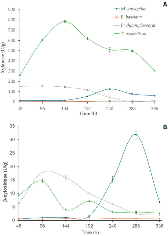 Hemicellulases production with M. anisopliae, B. bassiana, P. chlamydosporia and T. asperellum monocultures using sugarcane bagasse (SB) and wheat bran (WB) as substrates. Xylanase (A) and β-xylosidase (B) activities are expressed as U/g. Values represent the mean values of the experiments performed in triplicate (p < 0.05). Error bars indicate the standard deviation of the mean.
