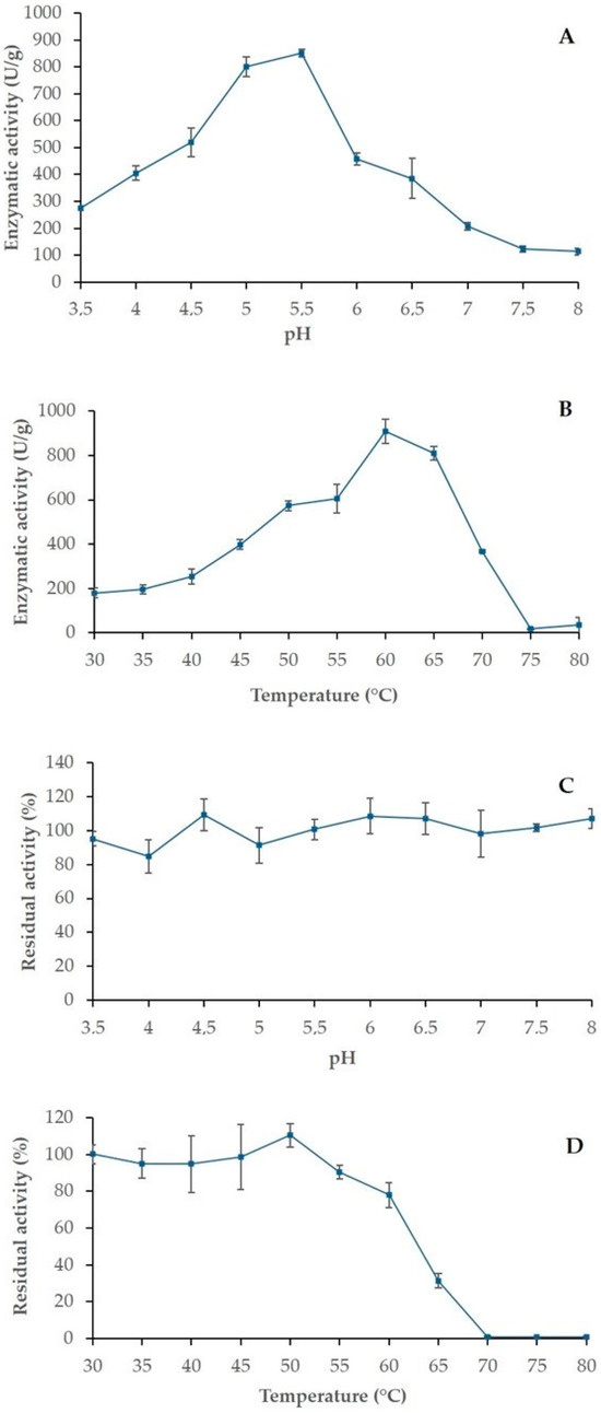 Effects of pH and temperature on the β-glucosidase activity of the M. anisopliae HTM cocktail. (A) optimum pH, (B) optimum temperature, (C) pH stability and (D) thermostability. The results are expressed as the average ± standard deviation (n = 3).