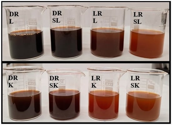 Coffee samples. LR: Light Roasted; DR: Dark Roasted, L: Lactobacillus plantarum ELB75; K: Kombu coffee (SCOBY-fermented coffee); SL: L-fermented coffee containing spent coffee grounds; and SK: Kombu coffee containing spent coffee grounds.
