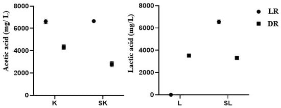 Acetic acid is the primary metabolite in kombucha production due to the activity of acetic acid bacteria (AAB) present in the symbiotic culture of bacteria and yeast (SCOBY) [,]. Lactic acid bacteria (LAB), on the other hand, contribute to the production of both lactic and acetic acid through homofermentative and heterofermentative pathways []. Given the significance of these organic acids in determining the sensory and functional properties of fermented beverages, this study focused on quantifying their production in fermented coffee samples. The concentrations of acetic acid and lactic acid in the fermented coffee samples are presented in Figure 3. At the end of fermentation, acetic acid production was detected exclusively in K-fermented coffee samples. Acetic acid levels in K and SK coffee brews were similar in LR coffee beans (6658 mg/L). In DR samples, acetic acid levels were measured at 4331 mg/L in K-fermented coffee, while this value decreased to 2797 mg/L when K fermentation was performed with spent coffee grounds. In previous studies on kombucha fermentation, different substrate sources have been reported to result in varying levels of acetic acid production [,,]. The composition of the fermentation medium has been shown to significantly influence the metabolic activity of acetic acid bacteria (AAB), as specific substrate types can enhance acetic acid production []. This aligns with the observed differences in acetic acid production between light and dark-roasted coffee samples in this study. In both coffee types, lactic acid production was not detected in K-fermented samples. It can be attributed to the competitive interactions between LAB, AAB, and yeast within the SCOBY consortium. The dominance of acetic acid bacteria (AAB) as the primary microflora in a SCOBY [] may have inhibited the ability of LAB to produce lactic acid. This could be attributed to the competitive advantage of AAB in acidic environments and their efficient utilization of available nutrients, which often limit the growth and metabolic activity of LAB in traditional kombucha fermentation systems []. However, the presence of lactic acid in L-fermented samples highlights the role of LAB in acid production under specific conditions. Although lactic acid was not detected in low-roasted coffee samples inoculated with L, its concentration reached 6559 mg/L in the SL sample. In DR coffee brews, lactic acid production was observed at levels of 3516 mg/L and 3310 mg/L in L and SL samples, respectively.