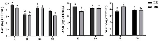 Lactic acid bacteria (LAB), acetic acid bacteria (AAB), and yeast counts of coffee samples. LR: Light Roasted; DR: Dark Roasted; L: Lactobacillus plantarum ELB75; K: Kombu coffee (SCOBY-fermented coffee); SL: L-fermented coffee containing spent coffee grounds; and SK: Kombu coffee containing spent coffee grounds. Different letters (a–d) indicate significant differences (p < 0.05) among samples (L, K, SL, and SK fermented samples) in DR and LR coffee group.