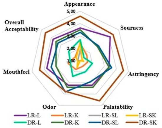 The results of sensory analyses of the coffee samples are presented in Figure 5. Panelists evaluated the samples according to appearance, sourness, astringency, palatability, odor, mouthfeel, and overall acceptability. The highest-rated sample across all sensory parameters was the dark-roasted SK sample. Panelists described most samples as sour, with the exception of the light-roasted L and the dark-roasted SK samples, which were perceived as more balanced in flavor. In terms of palatability, the L-fermented LR coffee brews received the second-highest score, following the dark-roasted SK sample.