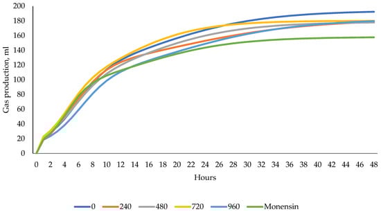 Gas production curves of the in vitro fermentation of diets with neem cake inclusion at levels of 0 (negative control), 240, 480, 720, and 960 mg/kg DM as well as monensin at 30 mg/kg DM.