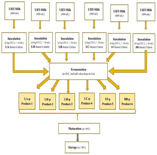 These six featured strains (coded LA, LH, LB, LC, ST, and BB) were activated twice as single starter cultures. Firstly, the strains were individually inoculated at 2% of De Man, Rogosa and Sharpe (MRS) broth (Merck, Germany) media and incubated for 48 h at 32 °C under micro-anaerobic conditions (with 5% CO2) except for the BB strain. This strain incubated under anaerobic conditions (using an anaerobic jar; Anaerocult® 116275-Millipore, Merck, Germany). Then, the developing cultures were again inoculated into the same media and activated for the second time under the same conditions for 18 h. After the second activation, the resulting active cultures were centrifuged at 3600× g (Hettich Rotina380/380 R, Hettich GmbH & Co., Kirchlengern, Germany) for 15 min, and the pellets that were formed were washed with a physiological saline solution (PSS; 8.5% NaCl). The turbidity of each cell pellet was adjusted to a 0.5 McFarland value (8 log CFU L−1) to inoculate them in 10 mL PSS to the 490 mL of UHT-milk (6 log CFU L−1). So, the active suspensions of the strains were obtained to use as starter culture [].