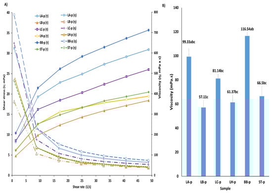 Rheograms of fermented samples (A), viscosity values of fermented samples at shear rate of 20 1/s (B). LA-p: was fermented with L. acidophilus, LB-p: was fermented with L. bulgaricus, LC-p: was fermented with L. casei, LH-p: was fermented with L. helveticus, BB-p: was fermented with B. bifidum, and ST-p: was fermented with S. thermophiles (A). Each parameter was evaluated separately, and there was a statistically significant difference between groups that did not have a common letter (a–c) (p < 0.05). Confidence interval of the arithmetic mean with a probability of 95% (B).