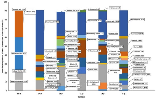 The difference between the other samples, except the BB-p, was observed to be less. Among the other samples, the LH-p sample stands out in terms of the high aldehyde, ketone, and carboxylic acid amounts. On the other hand, in this order, the LC-p sample has ketone, carboxylic acid, and aldehyde groups, the LA-p sample has carboxylic acid group with a high value, then ketone, aldehyde groups, and alcohol groups, the LB-p sample has aldehyde, ketone, and carboxylic acid groups with an effect at an equal height level, followed by alcohol groups. Finally, the ST sample can be expressed with ketone, carboxylic acid, and alcohol groups at a similar height level. Additionally, the terpene group contributed to the differentiation of the profiles of the LC-p and the LH-p samples compared to the other samples, while the amount of pyrazine contributed to the differentiation of the profile of the LH-p sample.