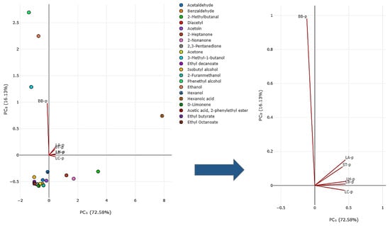 In the present study, according to the principal component analysis (PCA) (Figure 4), the relationship between the samples and the volatile aroma components was examined. According to these results, the BB-p sample was clearly separated from the others. As explained above, this result shows that the effect of the B. bifidum on the volatile aroma profile of the product is different from the others. In Figure 4, it is seen that the B. bifidum is correlated with the phenethyl alcohol, 3-methyl-1 butanol, and ethanol compounds. On the other hand, the LC-p sample also shows separation from the group, albeit with a small difference. It is seen that L. casei, which is effective in the production of this sample, is correlated with the compounds hexanol, 2-methylbutanal, 2-nonanone, 2-heptanone, the acetoin, and d-limonene. The hexanoic acid has a high positive correlation in all samples; however, this interaction is especially prominent in the LB and the LH samples. Therefore, this compound is most associated with the L. bulgaricus and the L. helveticus strains.