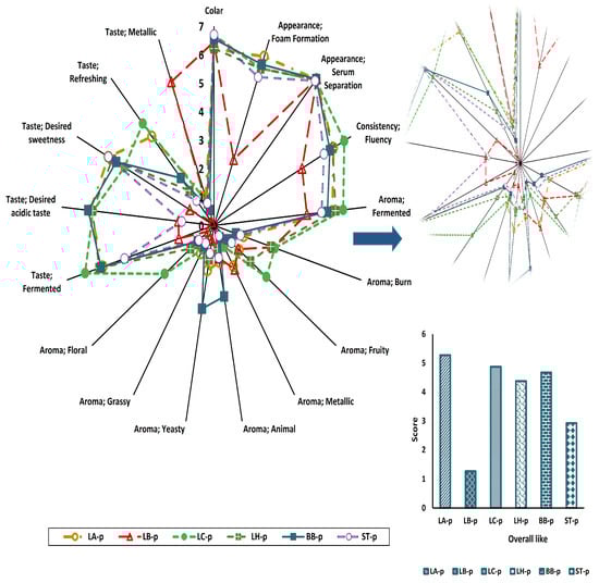 When aroma attributes were evaluated, the LC-p had the highest fermented odor score, while the LB-p had a lower score, indicating that the L. casei strain produced a more intense fermented aroma. Regarding fruity aroma, the LC-p had the highest score, followed by the LH-p (p < 0.05). The BB-p and the ST-p had the lowest scores. These results are consistent with the aroma profiles of the samples. This suggests that the L. casei and L. helveticus strains are associated with fruity aroma. In terms of the desired acidic taste attribute, the LA-p, LC-p, and LH-p samples stood out, while in terms of the desired sweetness attribute, the same samples and, additionally, the ST-p sample stood out. In the refreshing taste attribute, the LC-p and ST-p samples had the highest scores. According to these results, the L. casei and S. thermophilus strains stood out for both sweetness and freshness, while the L. casei, L. helveticus, and L. acidophilus strains stood out for suitable fermented and acidic taste. On the other hand, in terms of yeasty and animalic aroma, the BB-p produced with the B. bifidum strain had a significantly higher score than the other samples (p < 0.05). This can be explained by the higher amount of 3-methyl-1-butanol detected in the aroma component profile. The burnt aroma is somewhat related to the L. acidophilus, L. helveticus, and L. casei strains due to 2-methylbutanal. This does not give a negative aroma to the product; on the contrary, it gives a slightly sweet caramel note.