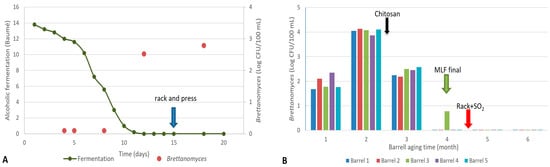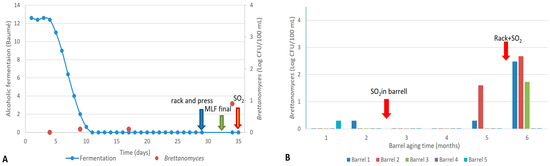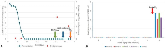 Monitoring alcoholic fermentation and Brettanomyces counts during vinification (A) and aging (B) of Cabernet Sauvignon vineyard wines. Arrows indicate oenological practices carried out by the winery.