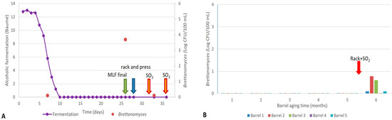 Monitoring alcoholic fermentation and Brettanomyces counts during vinification (A) and aging (B) of Merlot vineyard wines. Arrows indicate oenological practices carried out by the winery.