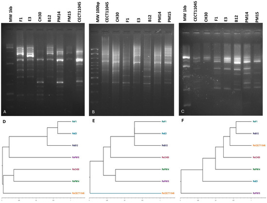 Band pattern obtained after PCR amplification and their UPGMA clustering with Dice coefficient for (A,D) M13; (B,E) COC and (C,F) OPK03 RAPD primers form the seven Brettanomyces reference strains. MW: Gene Ruler 1 kb (Fermentas Co., Ltd., Vilnius, Lithuania) and 100 bp (Invitrogen Co., Ltd., Carlsbad, CA, USA).