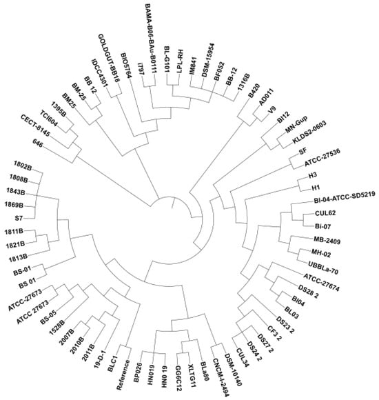 In the current work, an in-depth comparative genomic evaluation of Bifidobacterium animalis subsp. lactis was performed across seventy-one complete genomes available in NCBI Genbank. The strains were isolated from twenty-nine different isolation sources representing the human gut, human feces, infant gut, infant feces, breast milk, animal feces, dietary supplements, cultured food, and dairy food. The average GC (mol %) content achieved was 60.45 ± 0.2 which is typical for B. lactis genomes [51], although remarkably higher than lactic acid bacteria, which has a lower GC content compared to the genus Bifidobacterium. The genome size of Bifidobacterium animalis subsp. lactis was smaller compared to those identified in other Bifidobacterium species. This can be explained by the genome reduction process to decrease the biosynthesis capacity of the organism to retain and acquire genes related to the fermentation of a broad range of nitrogen and carbon sources [52,53].