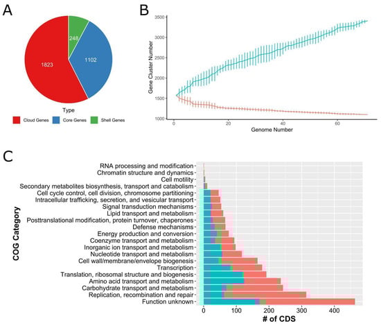 (A) Coding sequence distributions in the seventy-one B. lactis pan-genome. Cloud genes (red), core genes (blue), and shell genes (green). (B) Estimation of core (red line) and pan-genomes (turquoise line) of the seventy-one B. lactis strains by including genomes one by one. (C) Functional coding sequences in the core genome are shown in red bars, whereas functional coding sequences in the pan-genome are shown in turquoise bars across the genome of 71 B. lactis strains.