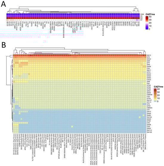 (A) The color gradient from lighter to darker colors represents the abundance of CAZymes found in each genome. GH: Glycoside hydrolase, GT: Glycosyltransferase, CE: Carbohydrate esterase, AA: Auxiliary activity, and CBM: Carbohydrate binding module. R programming language (version 4.1.1; R Core Team, 2021) was used to draw the heatmap. (B) A heatmap of the detailed CAZyme distribution and clustering in the 71 Bifidobacterium animalis subsp. lactis genomes.