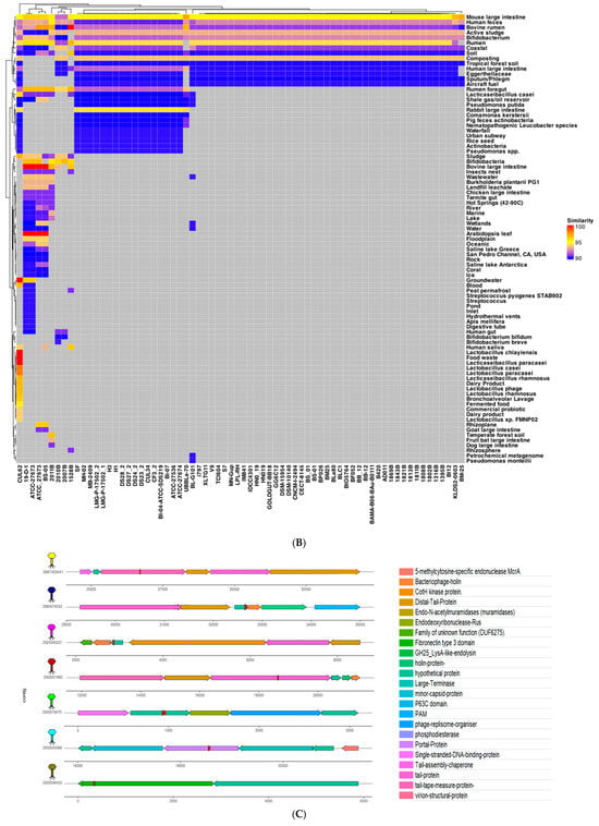 To visualize representative phage–host interactions captured by the CRISPR spacers, we examined seven high-confidence spacer matches in detail (Figure 4C). These spacers were selected for having a high sequence identity to their protospacers (~93–100%) and for originating from distinct environmental niches. Phage discovery tools (Cenote-Taker3 and PHASTEST) were then used to identify and annotate the corresponding viral/proviral sequences. For example, strain CUL62 contained two spacers targeting prophages in lactic acid bacteria: one spacer showed 96.8% identity to a Lacticaseibacillus rhamnosus prophage from a human vaginal isolate (within a tail tape measure protein gene), and another showed 96.97% identity to a Lacticaseibacillus rhamnosus (formerly Lactobacillus rhamnosus) prophage from a human fecal sample (targeting a hypothetical gene flanked by a bacteriophage holin and a CotH kinase gene). The latter spacer from CUL62 also matched a prophage in Lactobacillus baoqingensis (a fermented-food isolate) with ~96.8% identity, indicating that a single spacer can target multiple related phages from different environments. Similarly, a spacer from strain 2011B matched a phage assembled from activated sludge (93.8% identity, hitting a tail protein gene region flanked by other tail genes), while a spacer from strain 2010B aligned with a phage from an animal feces metagenome (94.7% identity, within a region flanked by a DNA-binding protein gene and an endodeoxyribonuclease Rus gene). Furthermore, strain 2007B harbored a spacer that perfectly matched a human gut metagenomic phage (100% identity, targeting a portal protein gene flanked by minor capsid and large terminase subunit genes), and strain 1528B contained a spacer with a 100% match to a phage from a soil metagenomic sample (targeting a fibronectin type III domain protein gene). These examples illustrate the broad ecological spectrum of bacteriophages that B. animalis subsp. lactis has encountered, as reflected in its diverse CRISPR spacer repertoire.