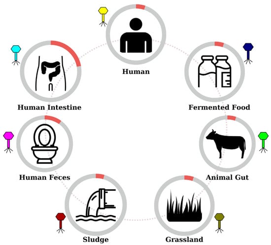 Interestingly, some spacers in B. lactis even matched viruses from unexpected sources such as sewage sludge and soil. The direct isolation of B. animalis subsp. lactis from these environments has not been reported, but indirect transmission routes can be proposed. For example, bacteria shed in animal or human waste could enter sewage systems and persist in sludge; the subsequent use of sludge in agriculture or environmental runoff might carry B. lactis (or its phages) into soils and water, which then come in contact with plants and grazing animals. Such a cycle would allow B. lactis or its genetic material to disseminate into grassland ecosystems, providing a plausible explanation for the spacer matches to phages from sludge and grassland habitats [57]. Ultimately, the diverse array of protospacer sources captured in the CRISPR loci of B. lactis highlights the extensive co-adaptation, both evolutionary and ecological, between B. animalis subsp. lactis and its viral predators across the species’ natural lifecycle and a broad spectrum of environments.
