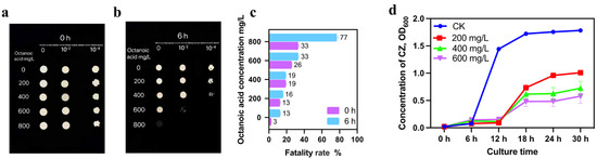 Morphological Changes and Growth Dynamics of S. cerevisiae CZ Under Octanoic Acid Stress: (a) Morphological Changes at 0 h: Morphological appearance of S. cerevisiae CZ colonies treated with different concentrations of octanoic acid for 0 h at 30 °C. (b) Morphological Changes at 6 h: Morphological appearance of S. cerevisiae CZ colonies treated with different concentrations of octanoic acid for 6 h at 30 °C. (c) Fatality Rates: Quantification of the lethality of S. cerevisiae CZ at different octanoic acid concentrations after 0 and 6 h of treatment. (d) Growth Curves: Growth dynamics of S. cerevisiae CZ under varying octanoic acid concentrations over time.