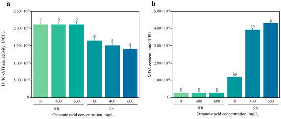 H+/K+-ATPase Activity (a) and Malondialdehyde Content (b) in S. cerevisiae CZ treated with Octanoic Acid at different concentrations. Note: Different letters denote significant differences at p < 0.05.