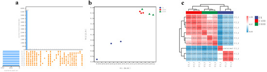 Upset Analysis (a), PCA Analysis (b), and Correlation Analysis (c) of Gene Expression: (a) Upset plot illustrating the number of genes uniquely or jointly expressed across different samples. (b) Principal Component Analysis (PCA) plot showing the distribution of samples based on gene expression levels. (c) Heatmap representing the correlation coefficients between biological replicate samples. C1_1, C1_2, and C1_3 represent the triplicate biological replicates of the control group (CK), while C2_1, C2_2, and C2_3 correspond to the 400 mg/L octanoic acid treatment group (C400), and C3_1, C3_2, and C3_3 represent the 600 mg/L octanoic acid treatment group (C600).