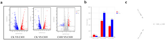 Analysis of Differential Gene Expression Levels: (a) Volcano plot depicting the log2 (fold change) vs. −log10 p-value for differentially expressed genes between control and octanoic acid-treated samples (400 and 600 mg/L). (b) Upset plot illustrating the number of upregulated and downregulated genes between the 400 mg/L and 600 mg/L octanoic acid treatment groups. (c) Venn diagram showing the overlap of differentially expressed genes among the control (CK), 400 mg/L (C400), and 600 mg/L (C600) octanoic acid treatments.