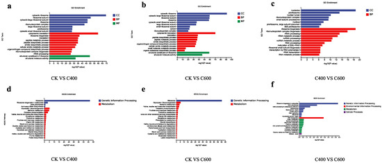 These findings indicate that S. cerevisiae CZ undergoes a stress response when exposed to octanoic acid, manifesting as the upregulation or downregulation of a large number of genes. Notably, when the concentration of octanoic acid increased from 400 mg/L to 600 mg/L, the increase in the number of differentially expressed genes was less pronounced compared to the difference relative to the control. This observation supports the notion that yeast may have evolved mechanisms to cope with moderate stress levels, but higher concentrations of stressors trigger a more limited response. What metabolic pathways do these differentially expressed genes participate in? Which genes should be selected for validation? We will address these questions in the subsequent analysis.