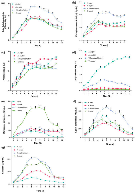 Temporal dynamics of key lignocellulolytic enzyme activities during corn stover SSF by different fungal strains. The activities of seven enzymes were monitored over a 12-day fermentation period: (a) Total cellulase activity (FPase), (b) Endoglucanase (CMCase), (c) Xylanase, (d) β-xylosidase, (e) Manganese peroxidase (MnP), (f) Lignin peroxidase (LiP), and (g) Laccase (Lac). Enzyme activities are expressed as U/g dry substrate. Lines represent means of triplicate experiments with error bars indicating standard deviation (SD).