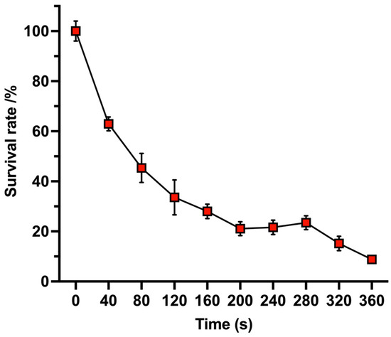 Dose–response curve showing the relationship between ARTP plasma exposure time and spore survival rate of T. longibrachiatum. Data points represent the mean values from three independent experiments, with error bars indicating standard deviation.