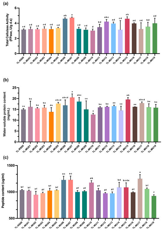 Erlenmeyer flasks (250 mL) containing 50 mL medium were inoculated with standardized spore suspensions (1 × 106 spores/mL final concentration) and incubated at 30 °C with orbital agitation (180 rpm) for 96 h. Following fermentation, crude enzyme extracts were obtained by centrifugation at 10,000× g for 15 min at 4 °C, and the supernatants were assessed for total cellulase activity (filter paper activity, FPase), water-soluble protein content, and peptide concentration. Mutants demonstrating superior performance across multiple parameters compared to the parental strain were selected for tertiary screening.