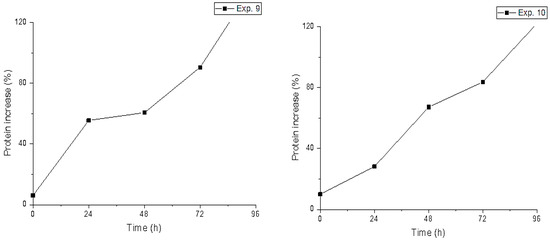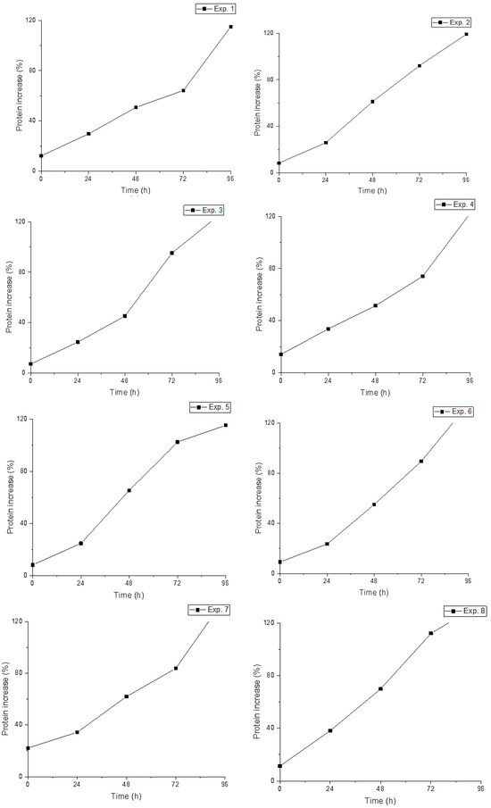 On the other hand, in experiments Exp. 2, Exp. 6, and Exp. 10, a lower accumulated production was observed, which may be related to suboptimal conditions, such as inadequate temperatures or possible nutritional limitations in the substrate. This suggests that fermentation was less efficient, reducing protein enrichment. In the experiments Exp. 1, Exp. 4, Exp. 7, and Exp. 8, the accumulated production showed an intermediate behavior, indicating that there was some level of conversion of the residues into microbial biomass, but without reaching the peaks observed in the most productive experiments.