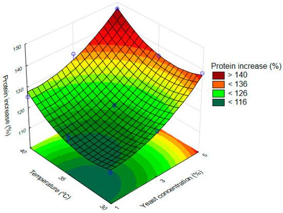 On the other hand, the lower part of the graph, where there are lower temperatures and low yeast concentration, shows a reduced protein increase, which indicates a lower use of the residues by the yeast. This trend may be associated with the lower enzymatic and metabolic activity of S. cerevisiae in less favorable conditions. Thus, the data confirm that optimizing these two factors—temperature and yeast concentration—is essential to maximize protein enrichment during semi-solid fermentation of jackfruit waste, making the process more efficient and sustainable for future applications.